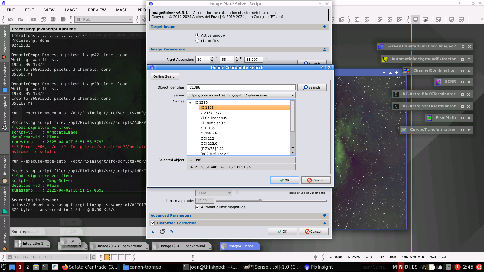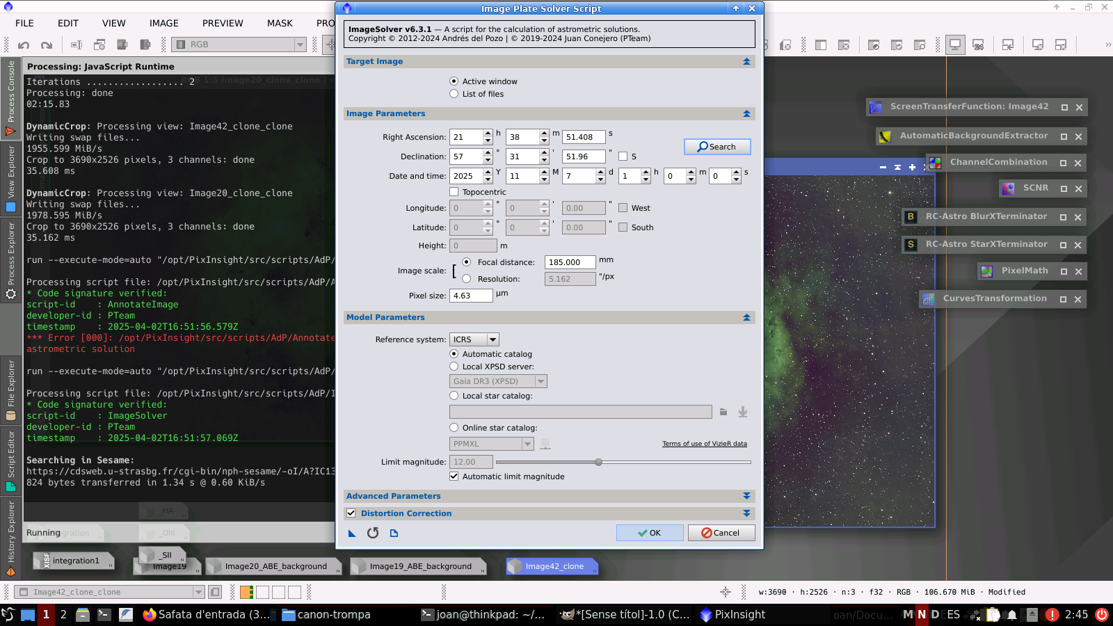 Ara vaig a fer la resolució de plaques amb l'script d'astrometria ImageSolver. Quan executem WBPP, normalment fa la resolució de plaques, però a mi m'agrada també passar-li ImageSolver perquè alguna vegada falla perquè al retallar la imatge o separar les estreles i fer una reducció, es perd la resolució de plaques.