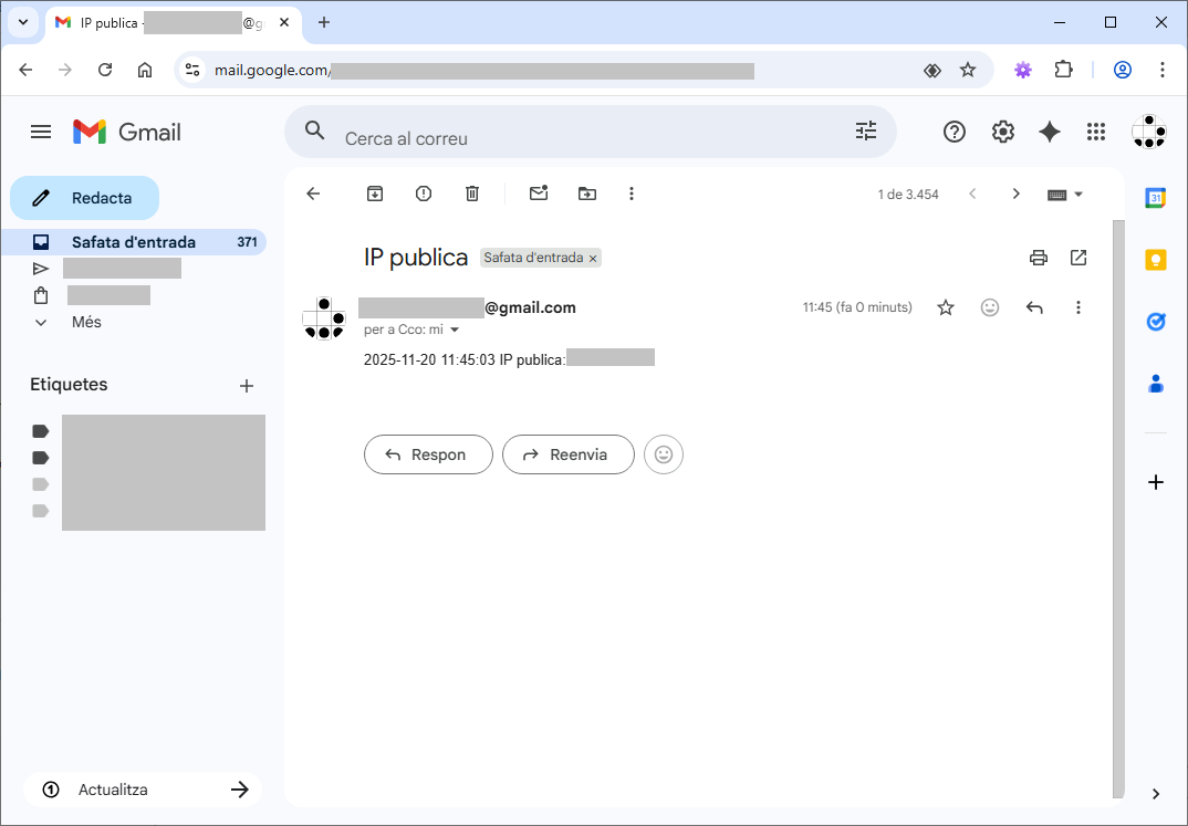 Ara cada hora rebrem un correu amb la IP pública. Em faré un filtre a Gmail per a que m'etiquete i m'arxive aquestos correus i no em molesten en la bústia principal.