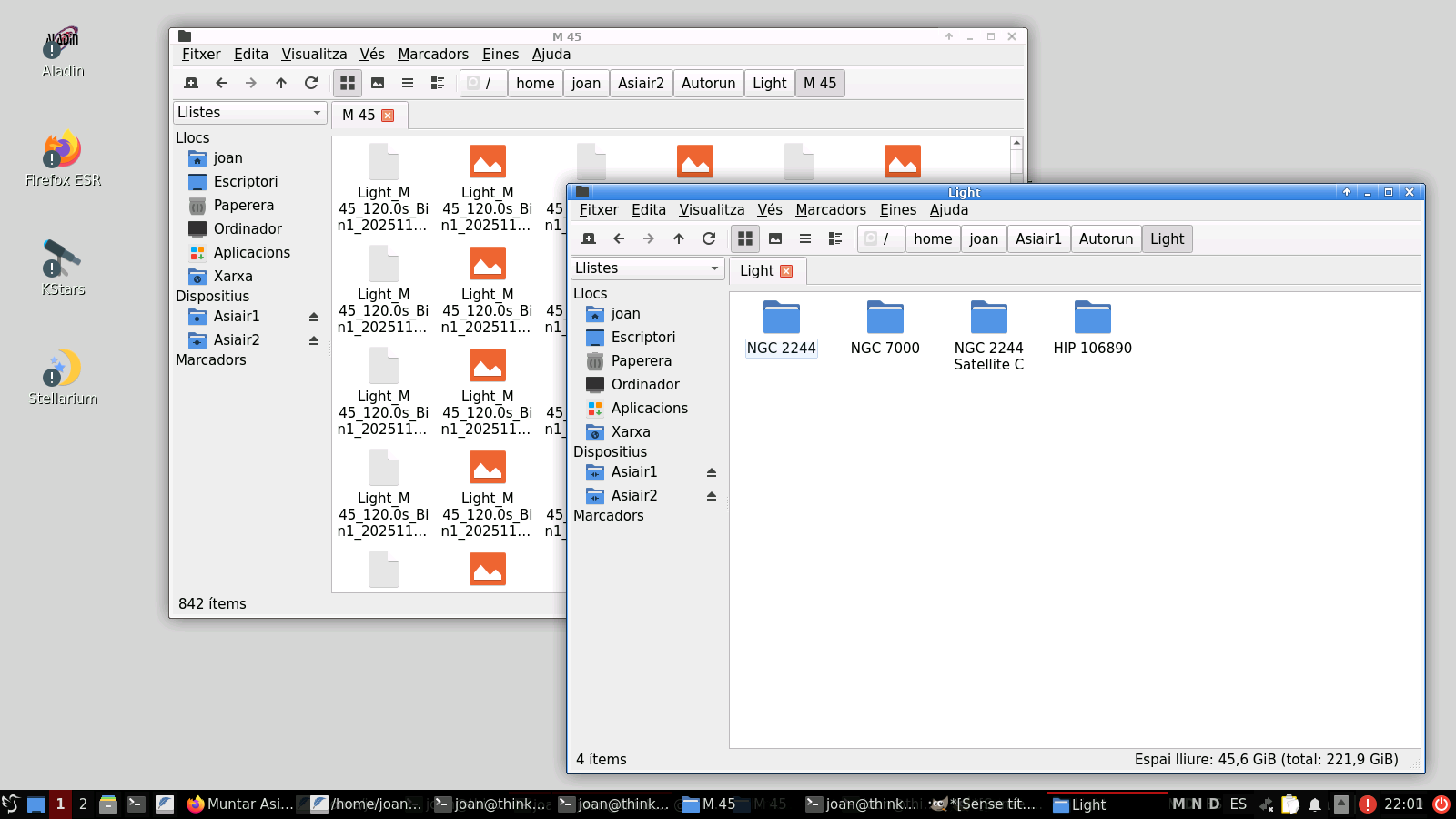 La idea d'aquest article és explicar el muntatge que tinc a casa amb 2 telescopis en el terrat, gestionats per 2 AsiAir, i a baix a l'estudi tinc l'ordinador GNU/Linux Debian 13 "Trixie" des d'on processe astrofotografies amb PixInsight.