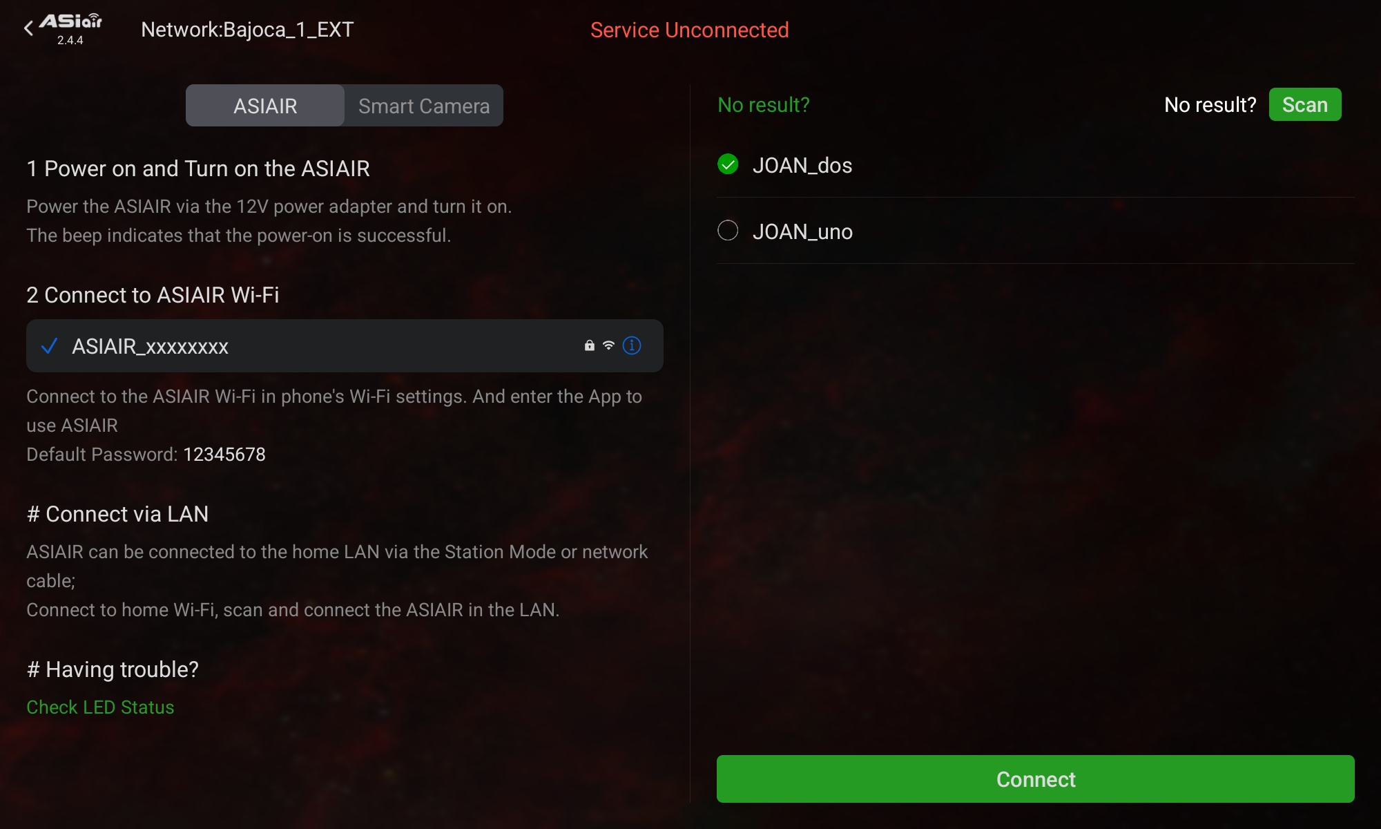 Ara et recomane configurar les AsiAir en mode estació afegint el SSID de la xarxa del extensor Wifi, de manera que cada AsiAir està per una banda emitint la seua senyal però per altra estàn "enrutades" o "canalitzades" dins de la Wifi de l'extensor. I d'aquesta manera, ja pots arribar a connectar amb les dos AsiAir amb l'App des del teu smartphone o tablet i podrem també fer captures de Lights o moure el telescopi on vullguem còmodament des de l'App a l'estudi, sense necessitat de pujar al terrat.