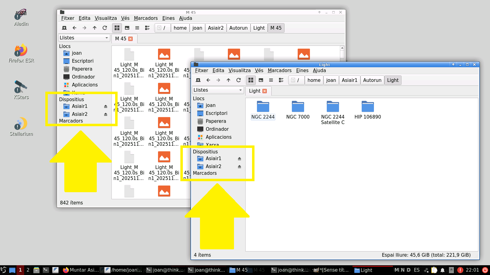 En el meu cas he muntat l'AsiAir nº 1 (que controla el telescopi William Optics ZenithStar 73) i també l'AsiAir nº 2 (que controla un tub Canon 70-200mm F/2.8). Ací pots veure com queden muntades en l'explorador de fitxers: