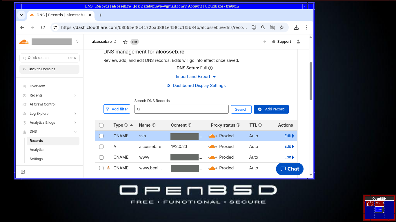 Ara necessite afegir un nou domini o subdomini en panel de control de Cloudflare on gestione els DNS dels meus dos dominis https://alcosseb.re/ i https://benicass.im. Aleshores ens autenticarem en la web de Cloudflare i afegirem el CNAME amb un domini o subdomini (subdomini en el meu cas) des d'on voldrem accedir al túnel via SSH: